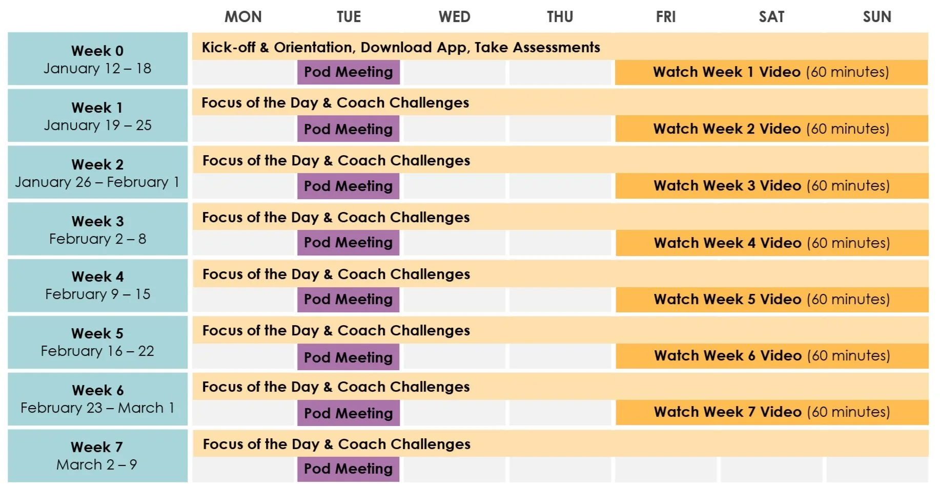 There will be 8 weekly 1-hour Pod meetings scheduled every Tuesday at 11:00 CST, starting January 13th.